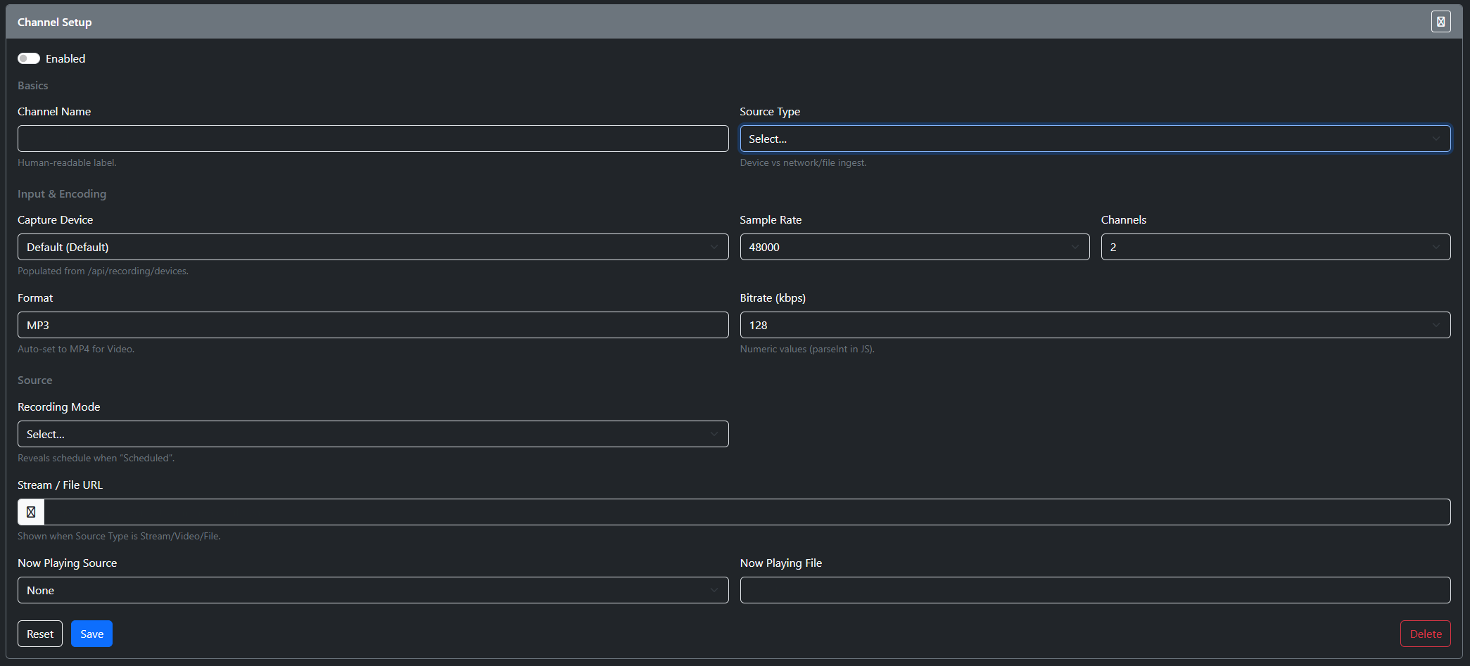 - Remote - if you have a machine capturing audio locally for this channel, enable this.